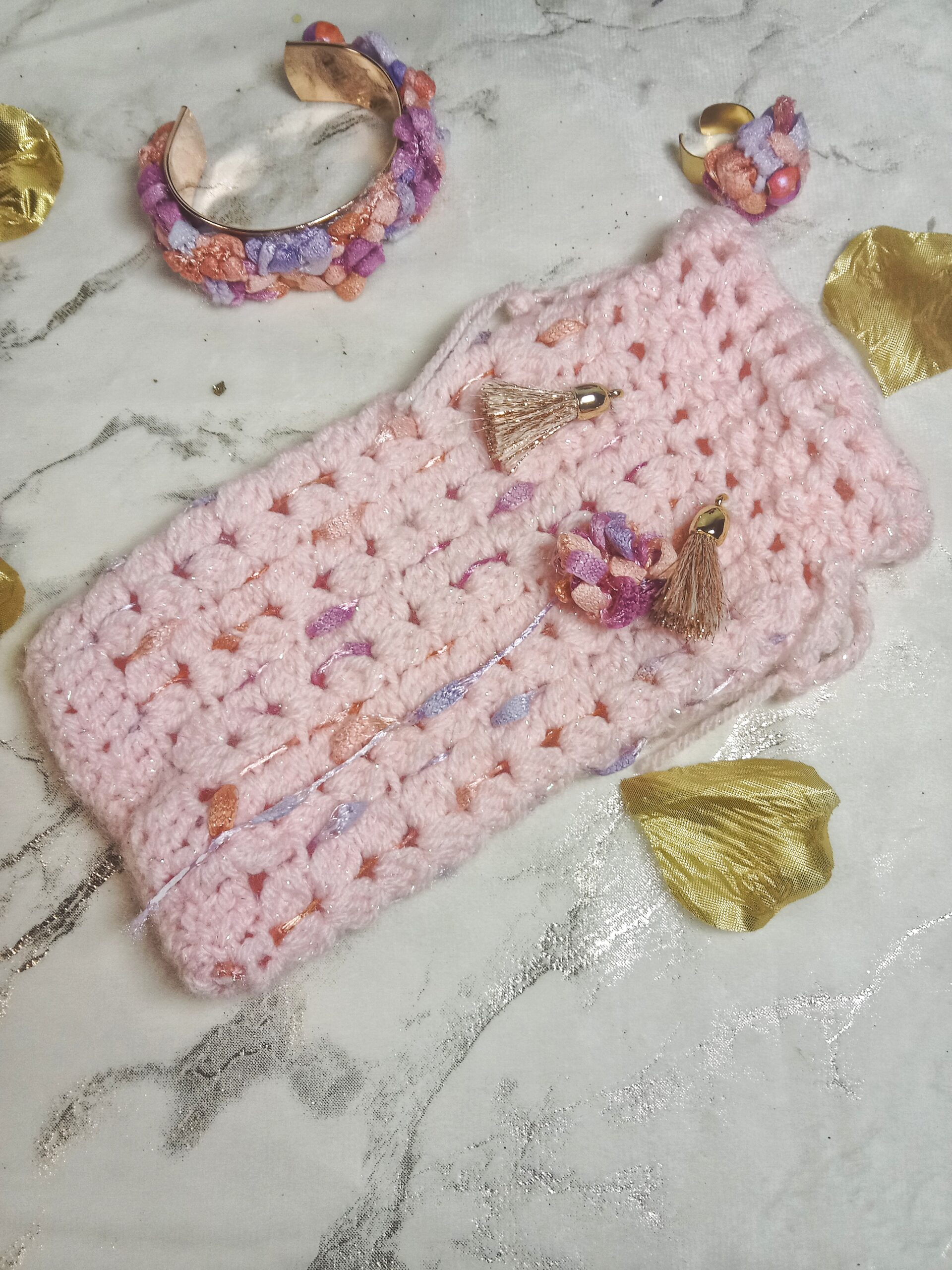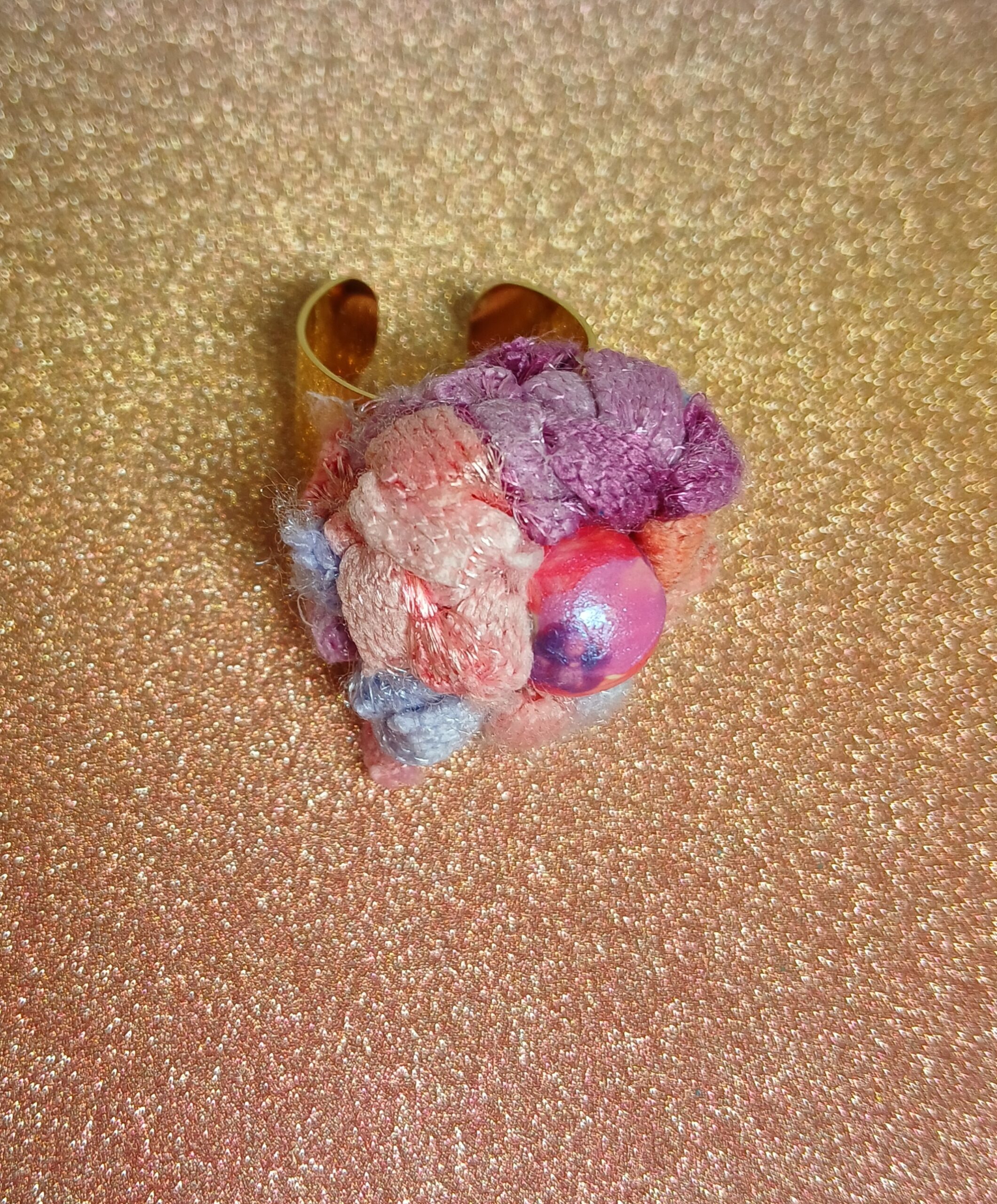 Bague en acier inoxydable doré, ornementée d’une création au crochet fil satiné couleurs pastel et sa perle en bois peinte à la main.