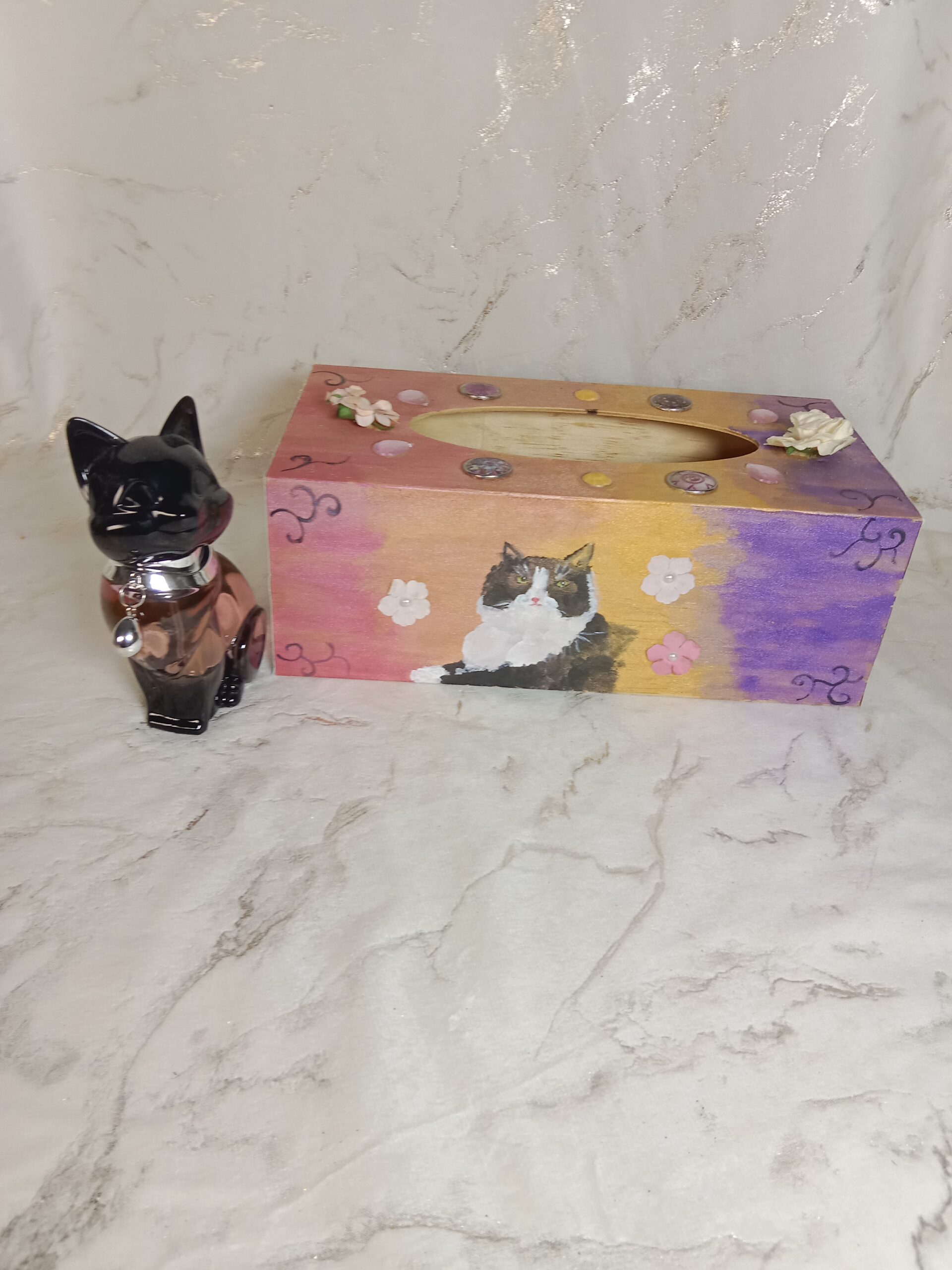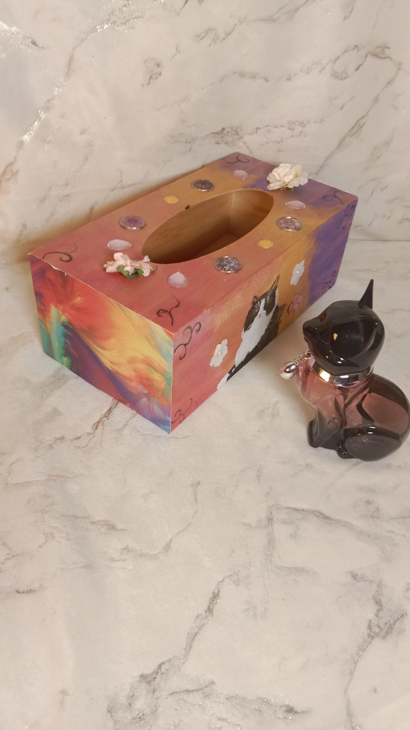 Boite à mouchoirs en bois peinte à la main , décorative aux couleurs harmonieuses avec un joli chat noir et blanc.