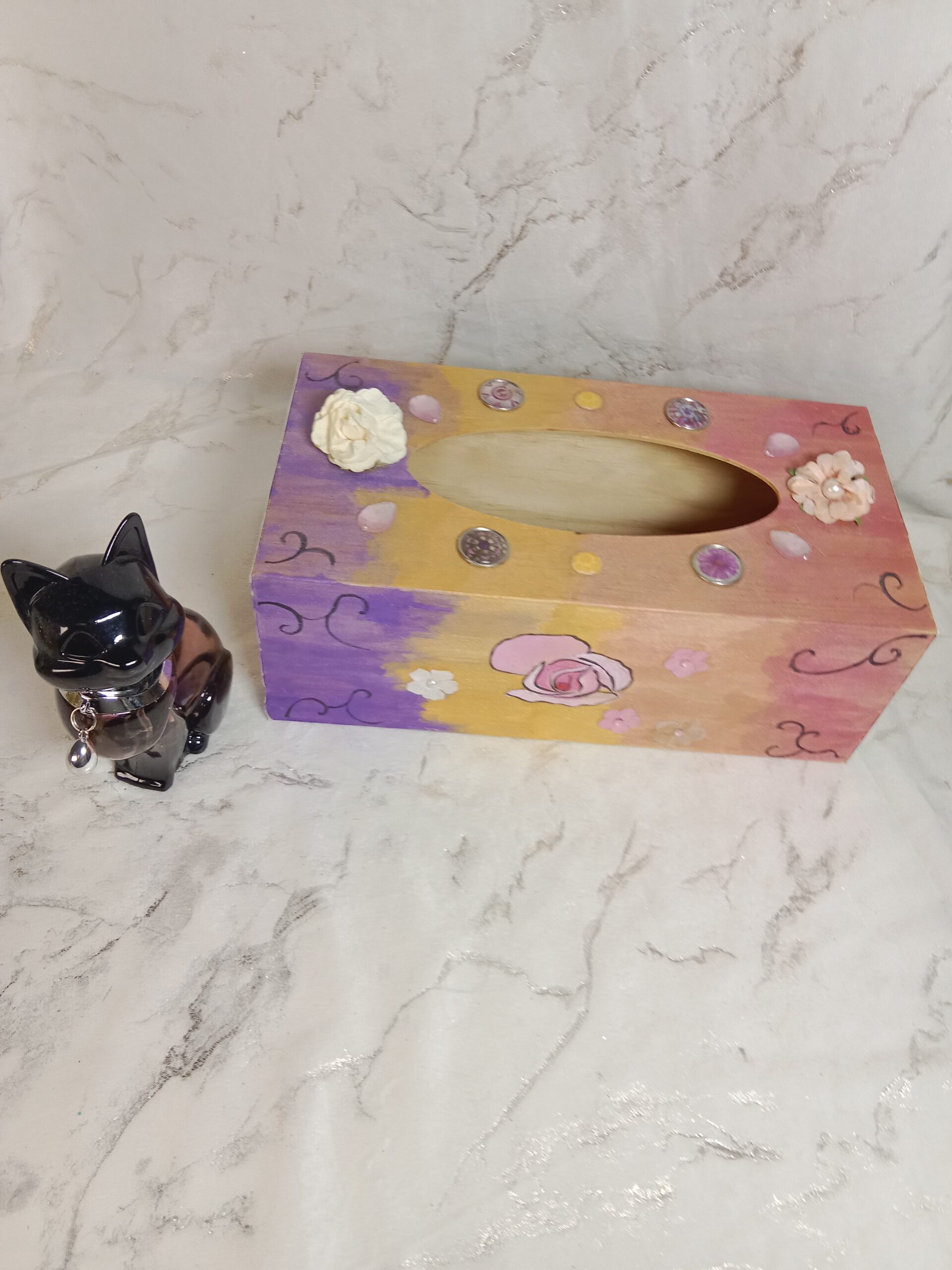 Boite à mouchoirs en bois. Peint avec des couleurs harmonisées en dégradé. De jolis motifs, fleurs, strass, papier                ornementent la boite. Vous y découvrirez un joli chat noir et blanc peint à la main en peinture acrylique, qui ressortira sur ces couleurs pastelles. De l’autre côté de la boite, une rose est également peinte à la main.