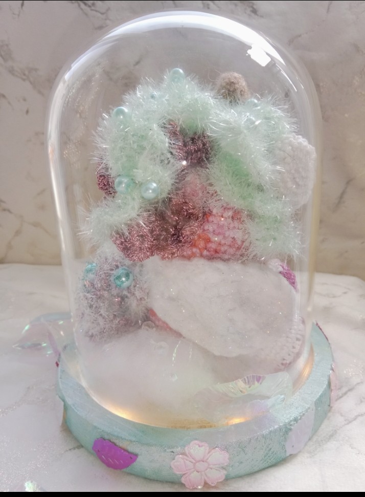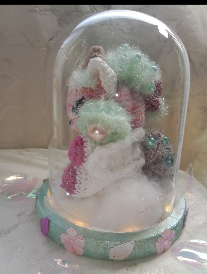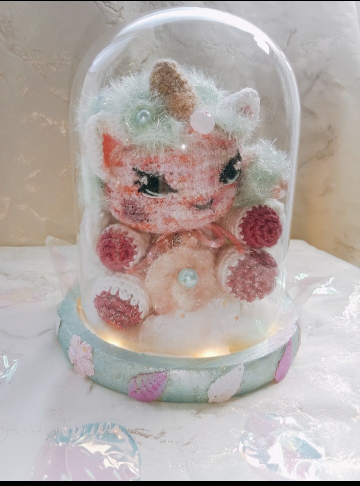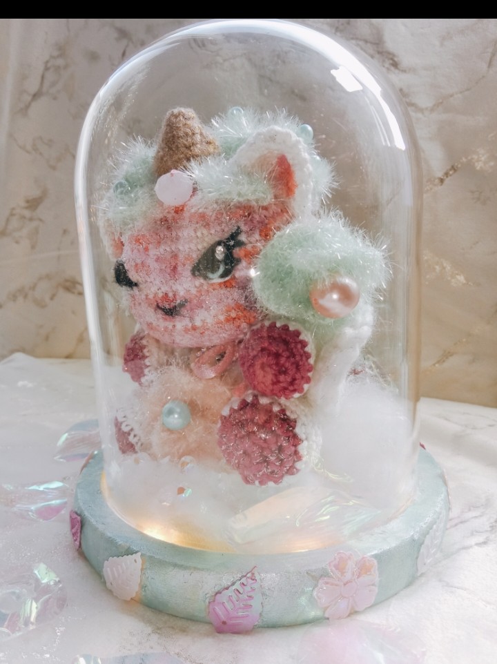 Globe en verre décoratif, avec une jolie licorne travaillée minutieusement au crochet avec différentes techniques et fils. De jolies perles en verre et strass garnissent la Licorne. Les couleurs ont été soigneusement choisies pour créer une ambiance magique et féerique. Une petite lumière illumine ce globe. Cet objet décoratif pourra prendre place dans une chambre d’enfants mais il ne faudra pas le laissez à porter des petits enfants. Le globe est donc en verre et fragile.