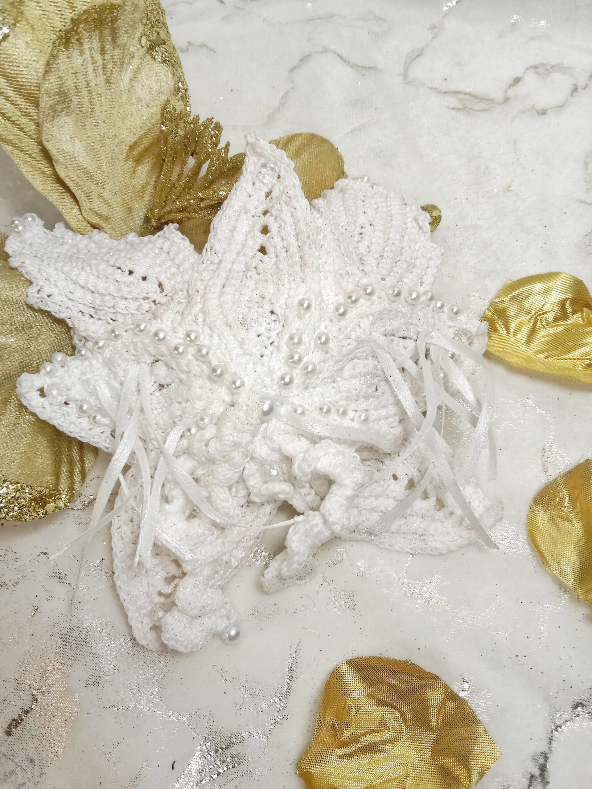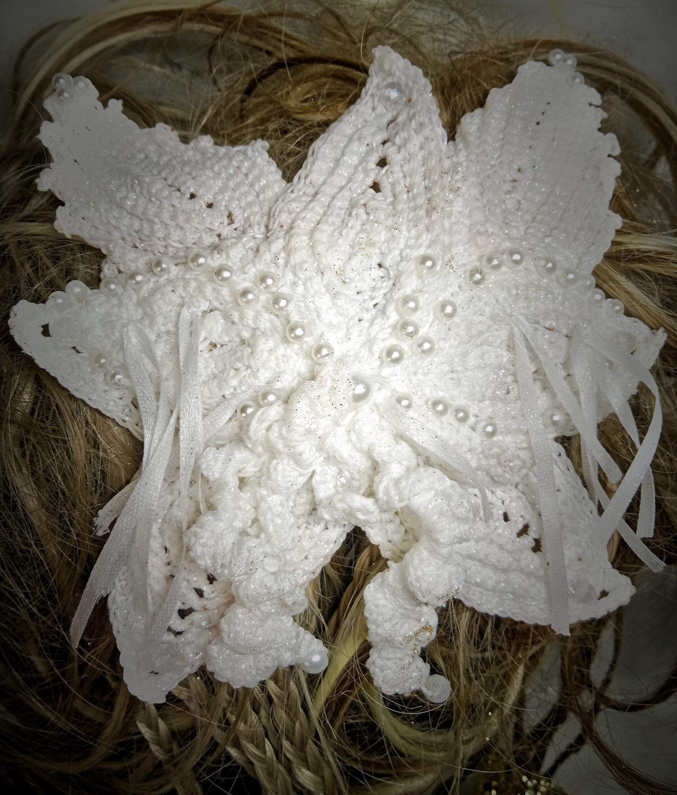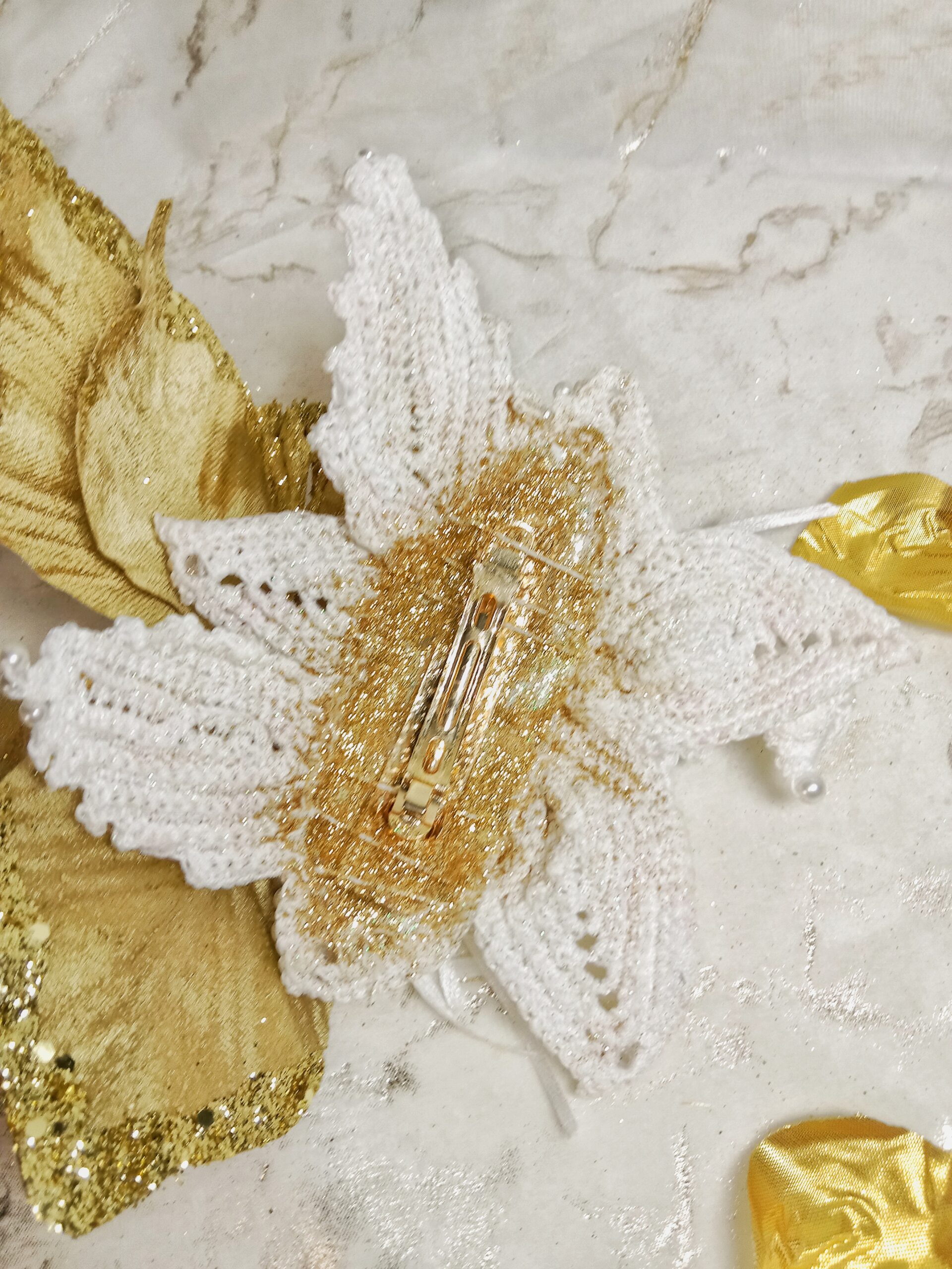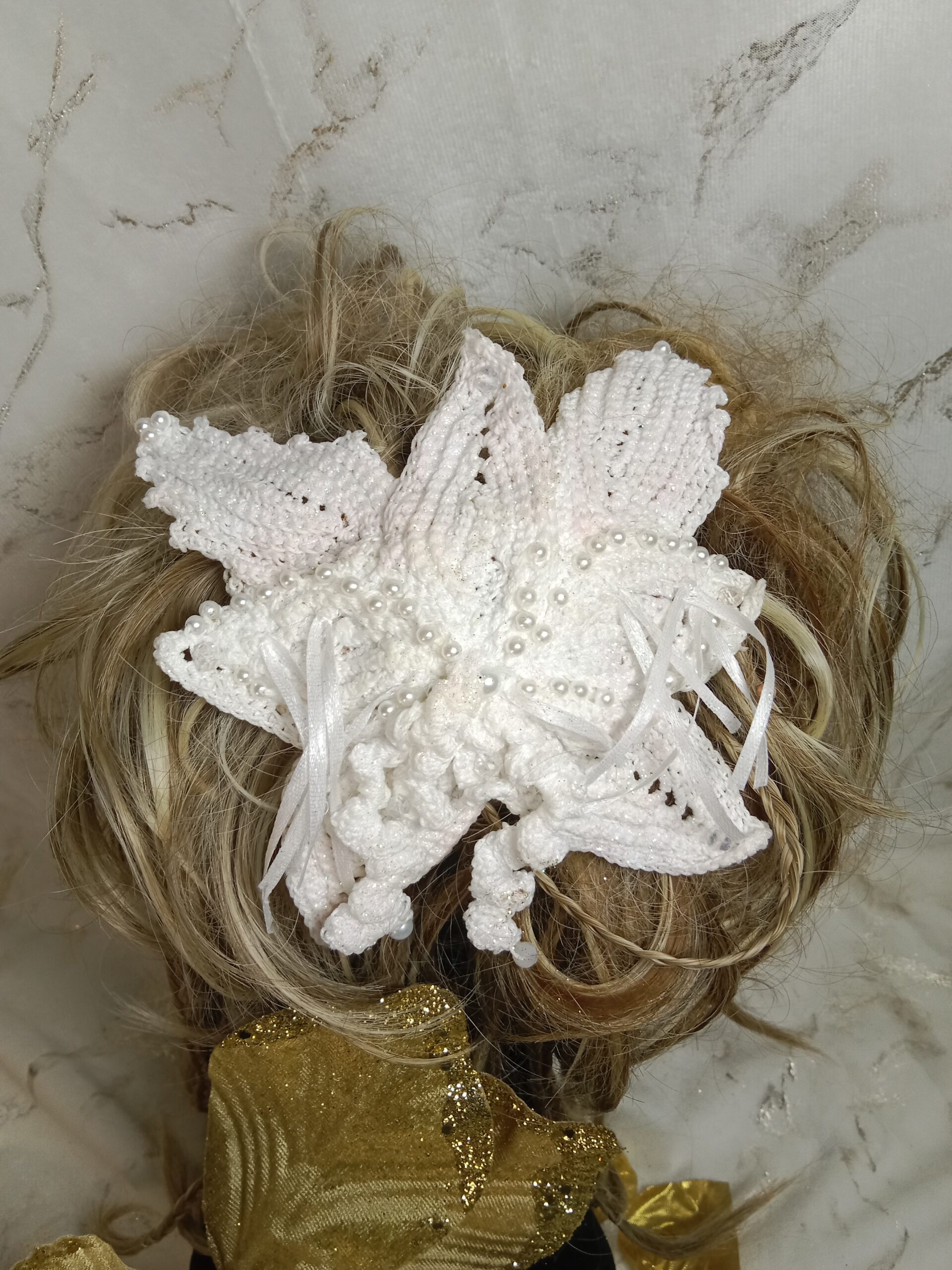 Barette travaillée avec beaucoup de précision et de détails au crochet, avec un fil soigneusement sélectionné, mercerisé en coton. La technique utilisée sur cet ouvrage s’appelle le crochet Irlandais, le travail des fleurs, et feuilles avec un très petit crochet ce qui donne un rendu léger, précis et affiné. Des perles en verre nacrées blanches sont cousues ainsi que des rubans satins de qualité. Une peinture textile pailletée recouvre l’ensemble. La pince est en métal doré agrémentée de paillettes dorées. Une création unique qui mettra en valeur votre coiffure pour cette journée exceptionnelle. Pour plus de détails contactez moi via le formulaire de contact