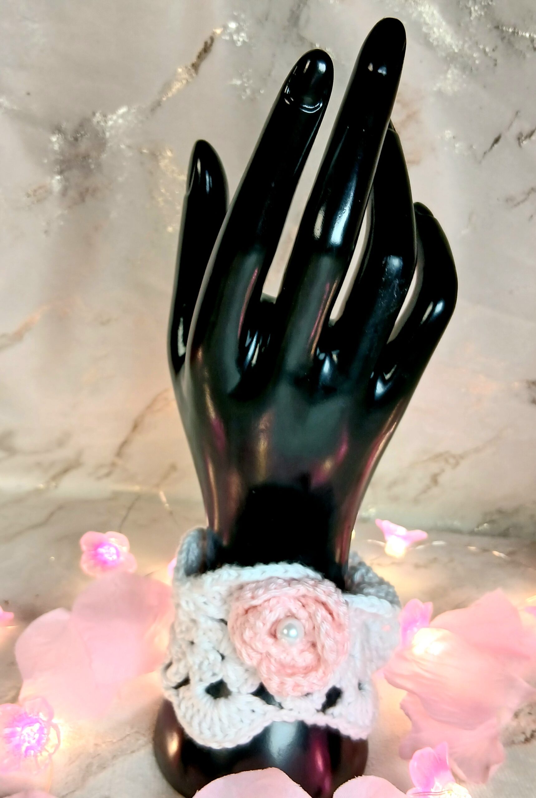 Manchette crochetée a coton, aux couleurs claires. Une très jolie rose rose crochetée en relief agrémentée d’une perle nacrée en verre, le tout formant un ensemble élégant, floral. Création unique qui sublimera votre tenue au quotidien. Les petits boutons nacrés ont été également soigneusement choisis. Un petit aperçu en vidéo: