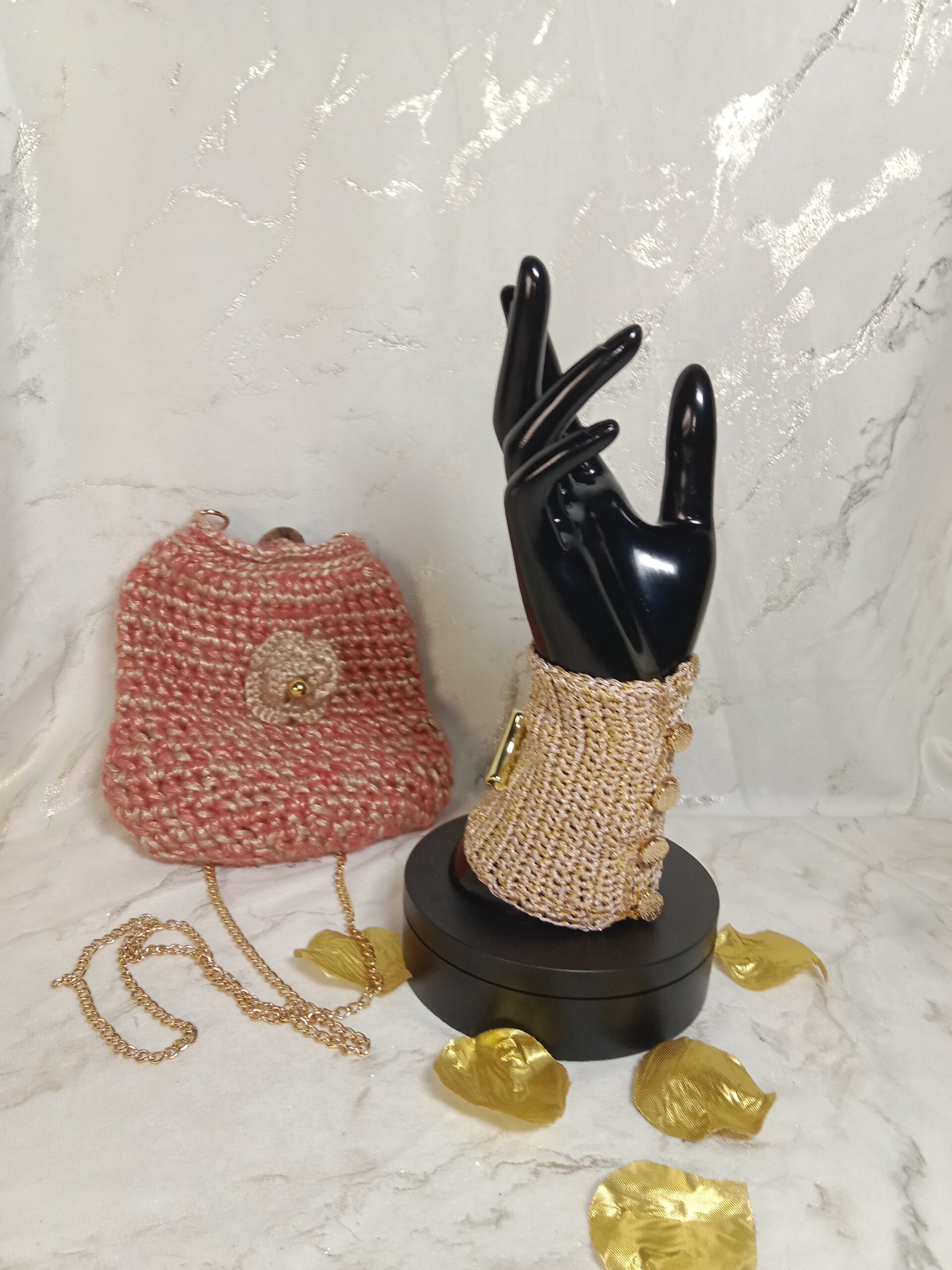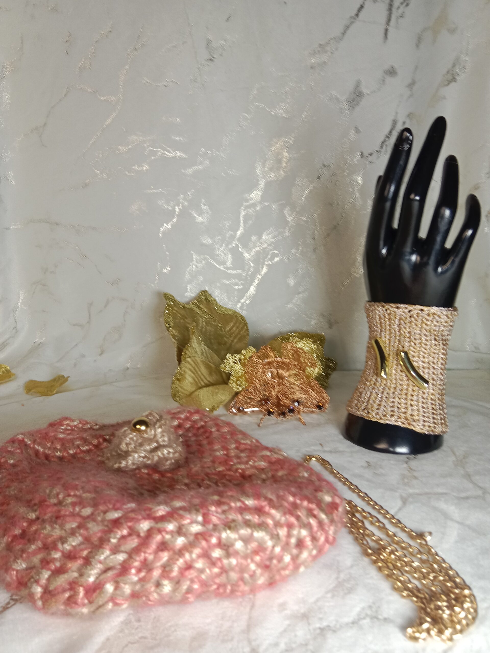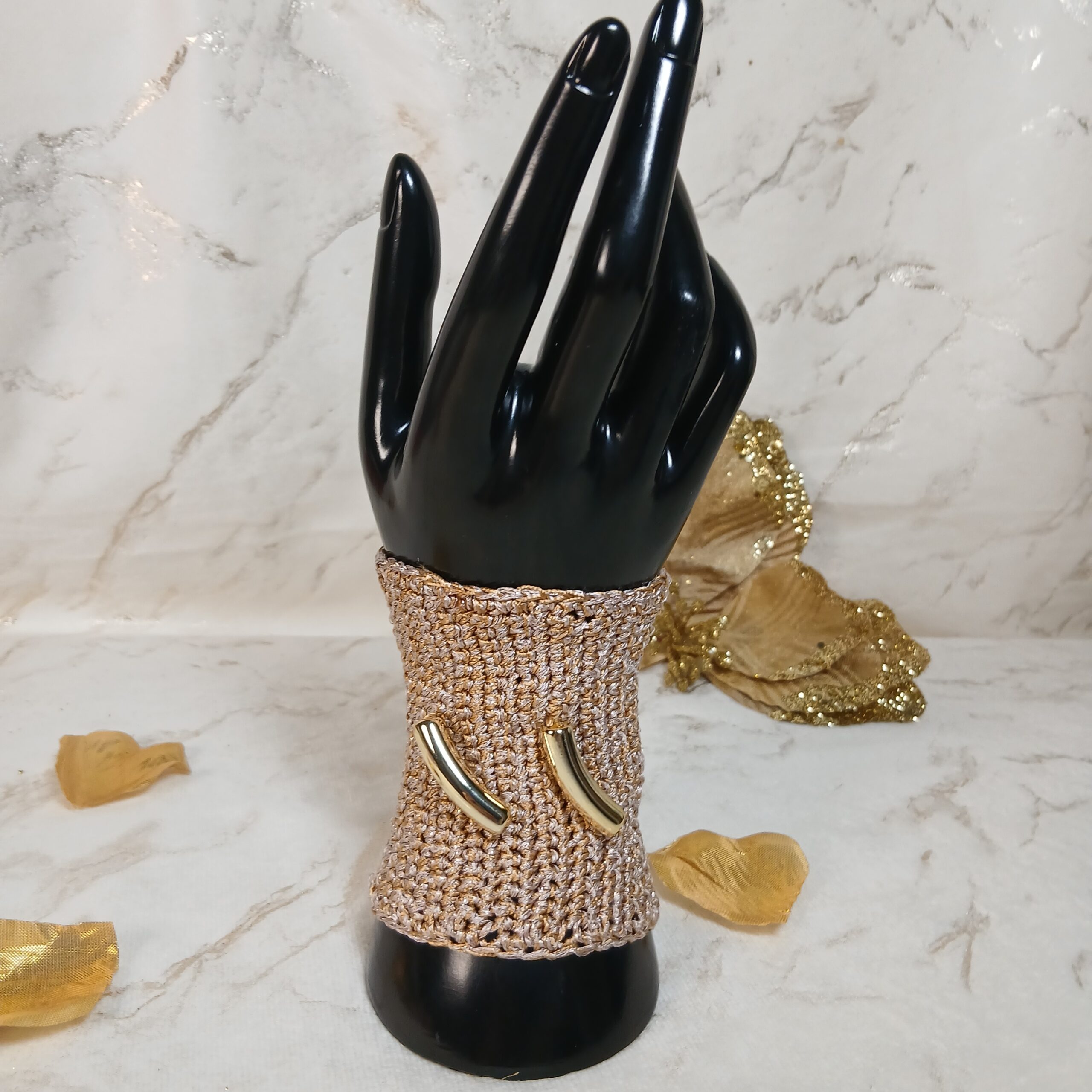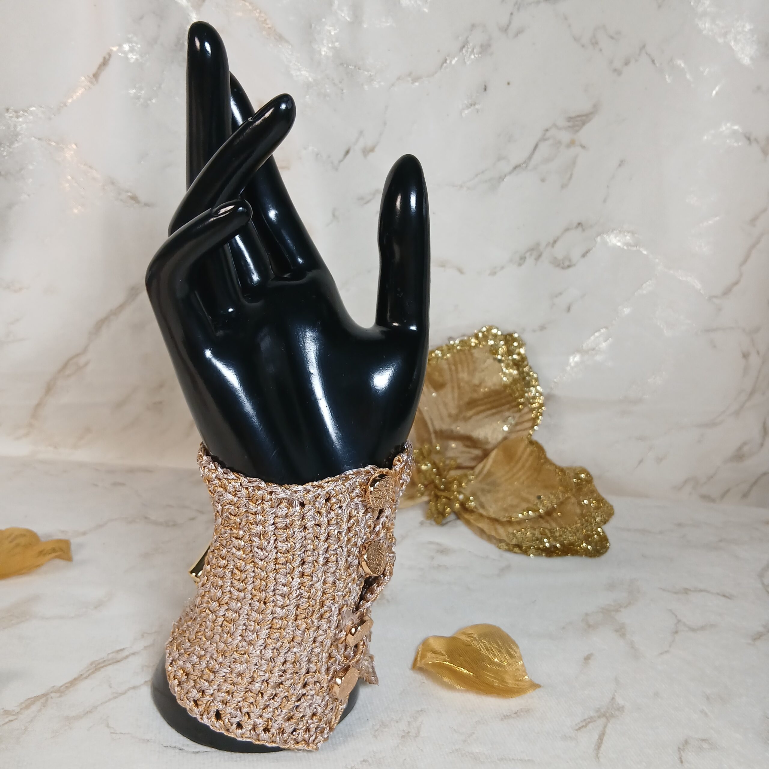 Manchette grand model soigneusement crochetée avec du fil fin scintillant cuivré et du fil fin scintillant doré. Les perles acryliques dorées allongées ornementent la manchette. Une manchette souple, très élégante et chic , les boutons dorés rajoutent une touche raffinée.  Vous pourrez l’assortir à une petite sacoche crochetée ou encore des boucles d’oreilles dorées.