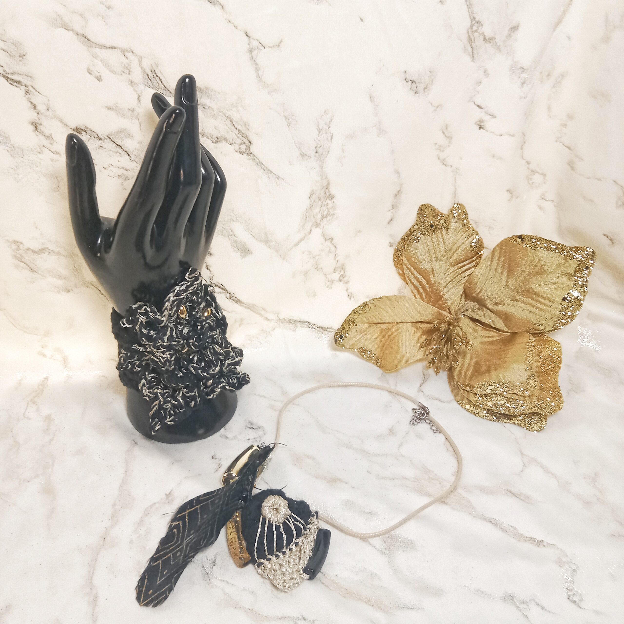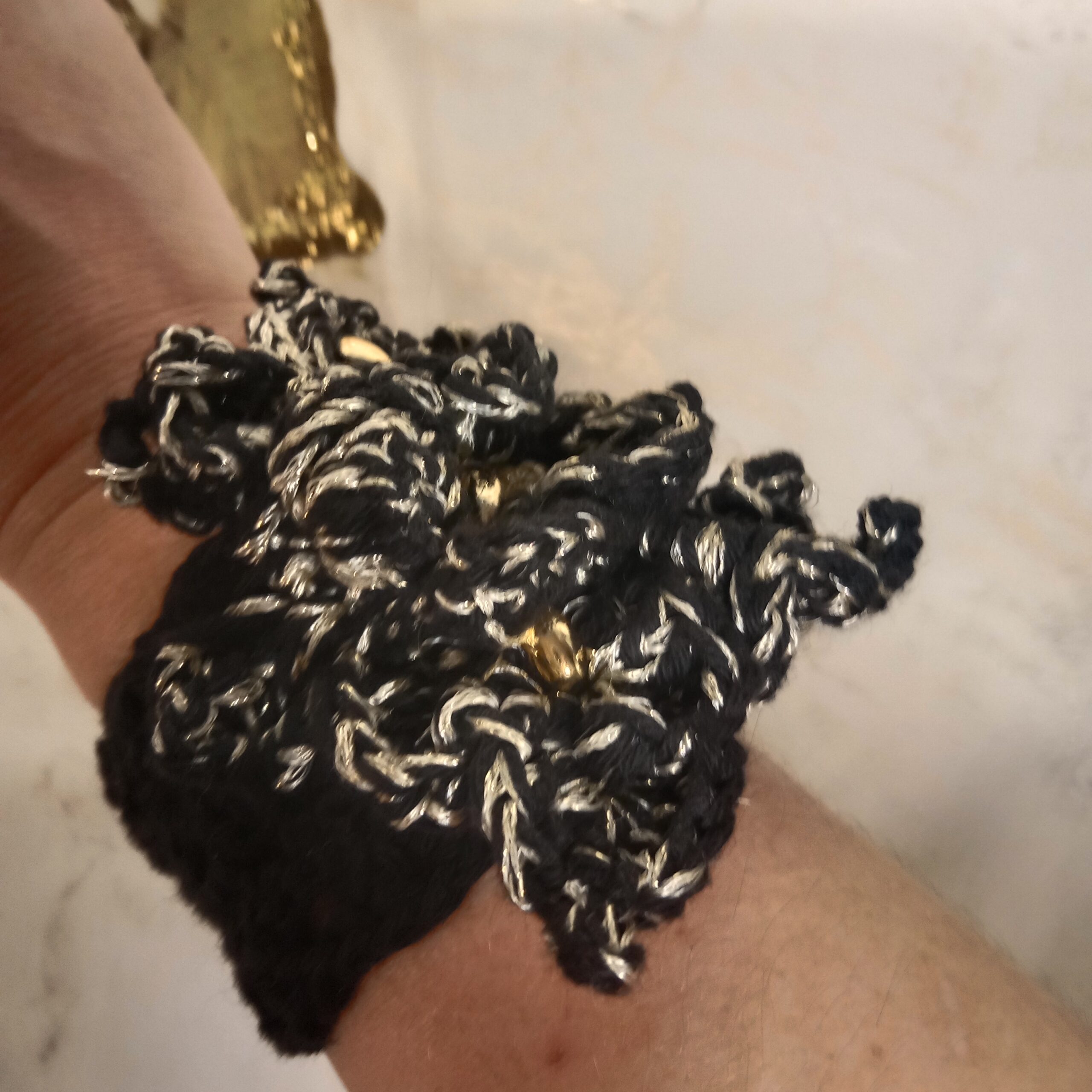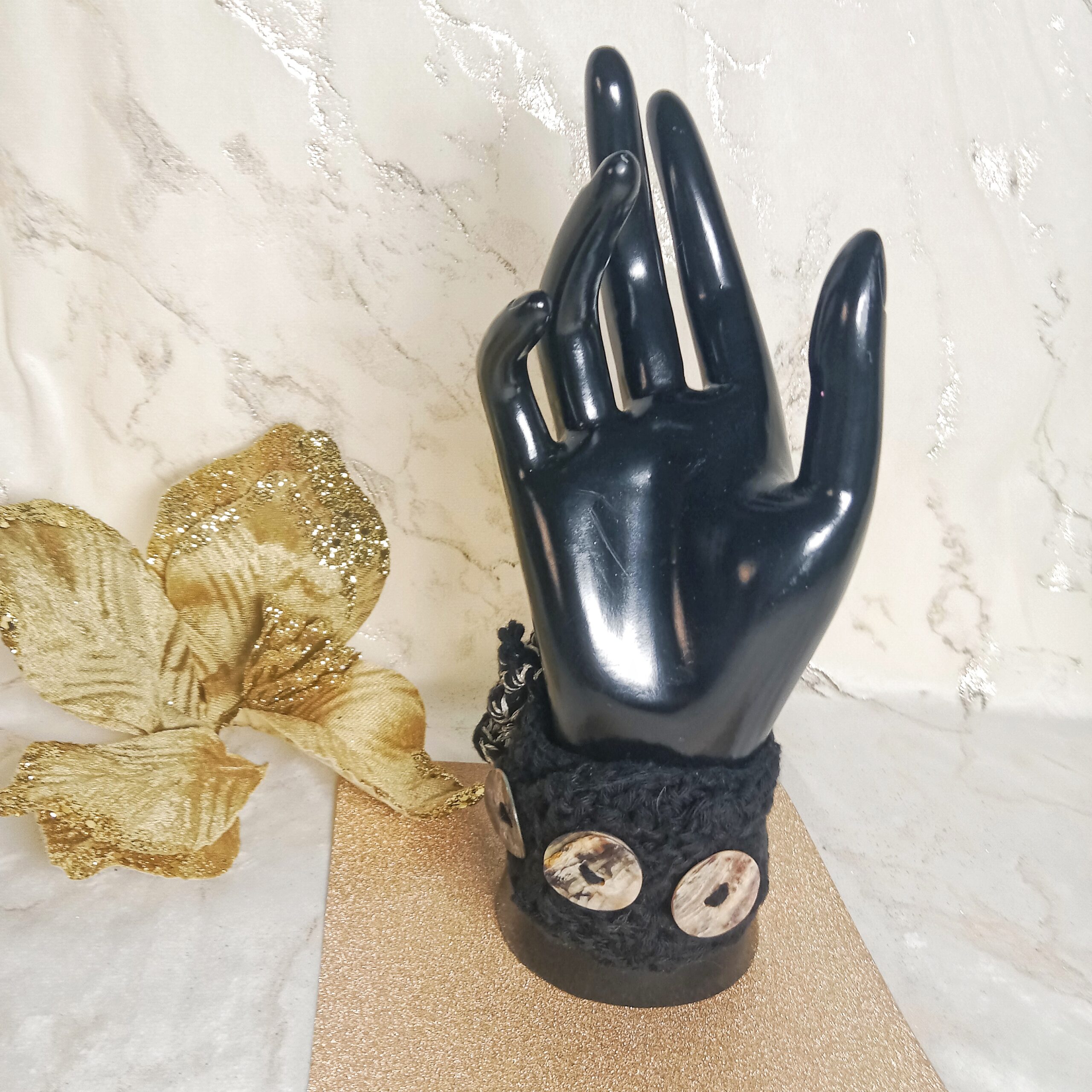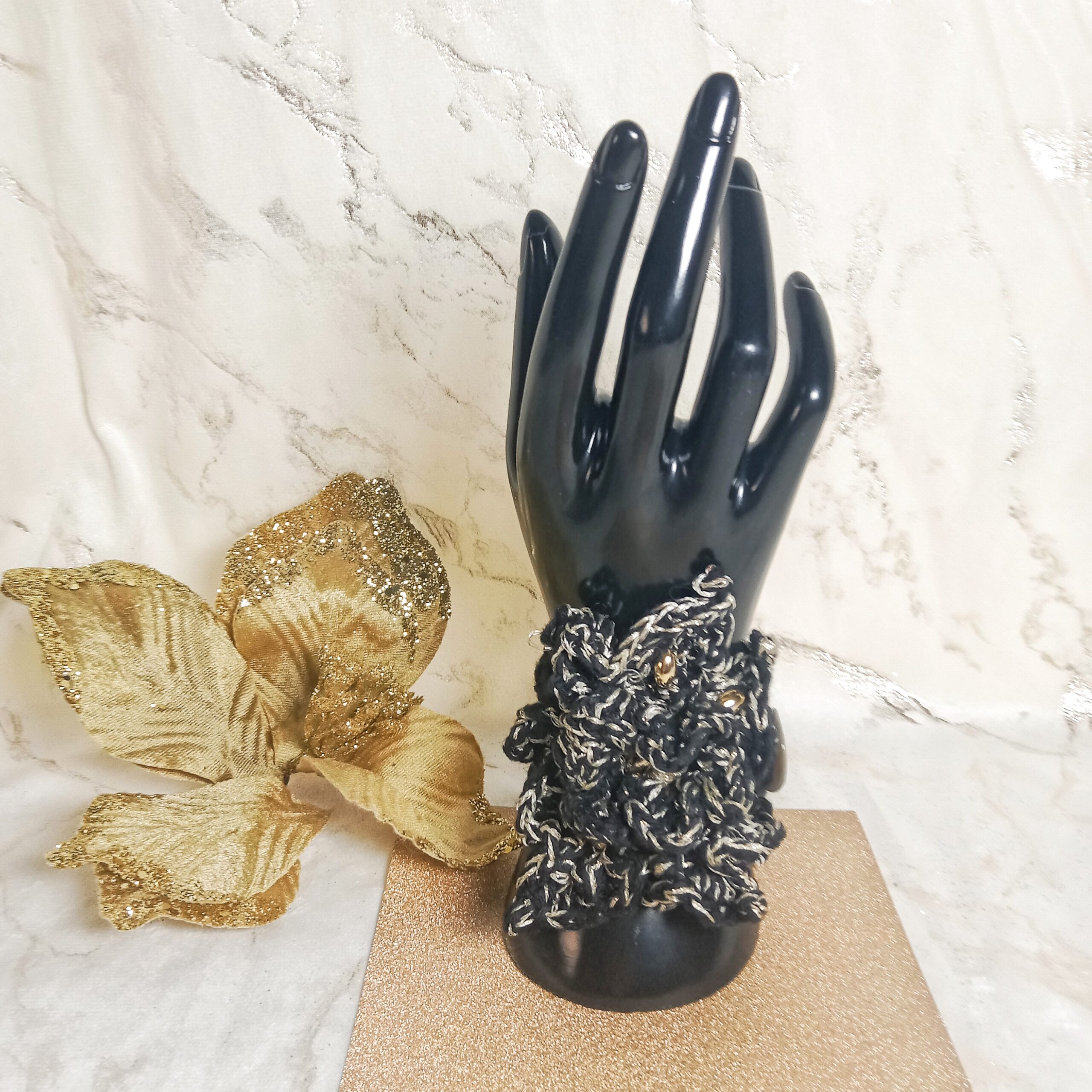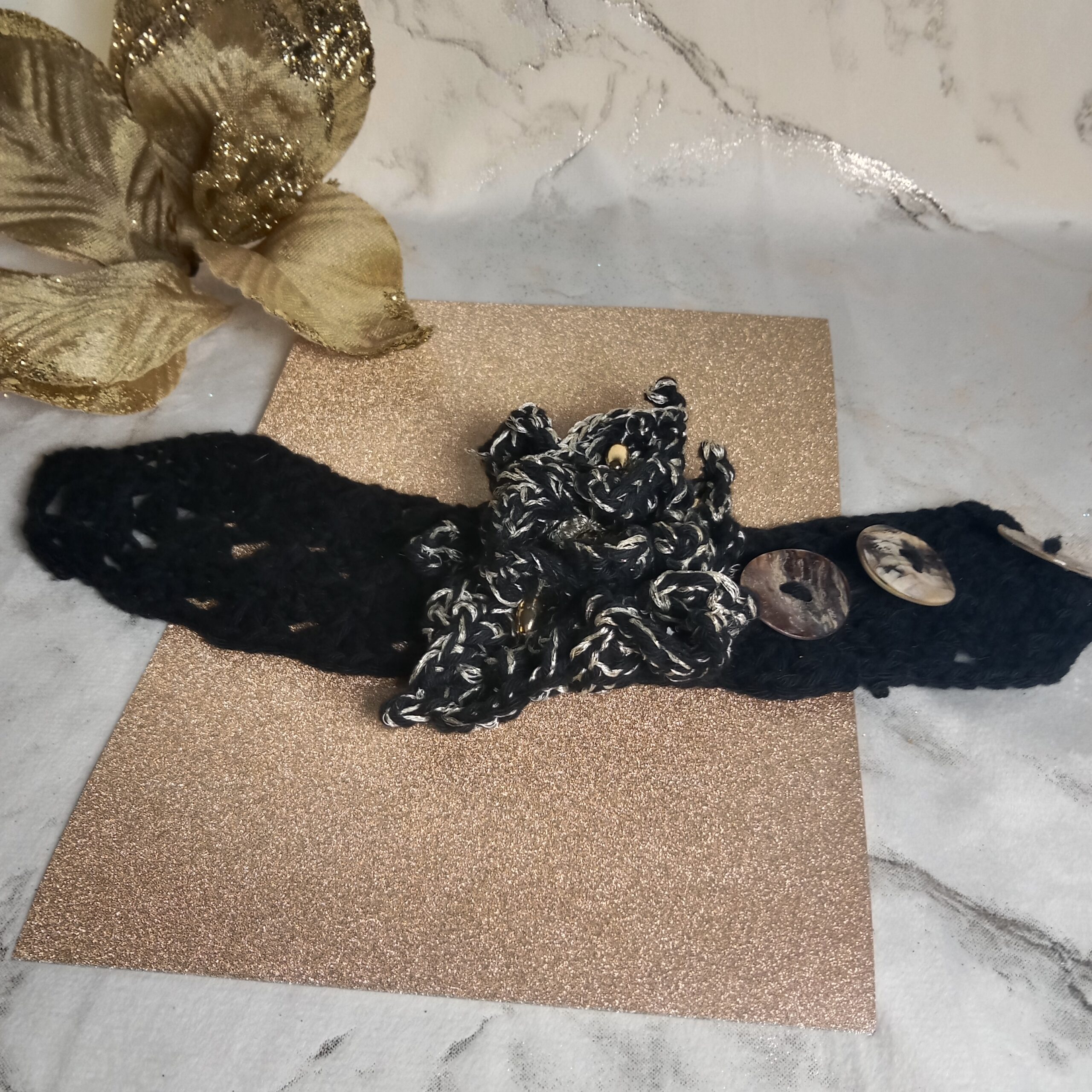 Manchette travaillée avec passion au crochet noir et dorée avec ses perles dorées. Un motif fleur est travaillé minutieusement en relief, technique du crochet irlandais avec deux fils noir en coton et doré fil mercerisé brillant.