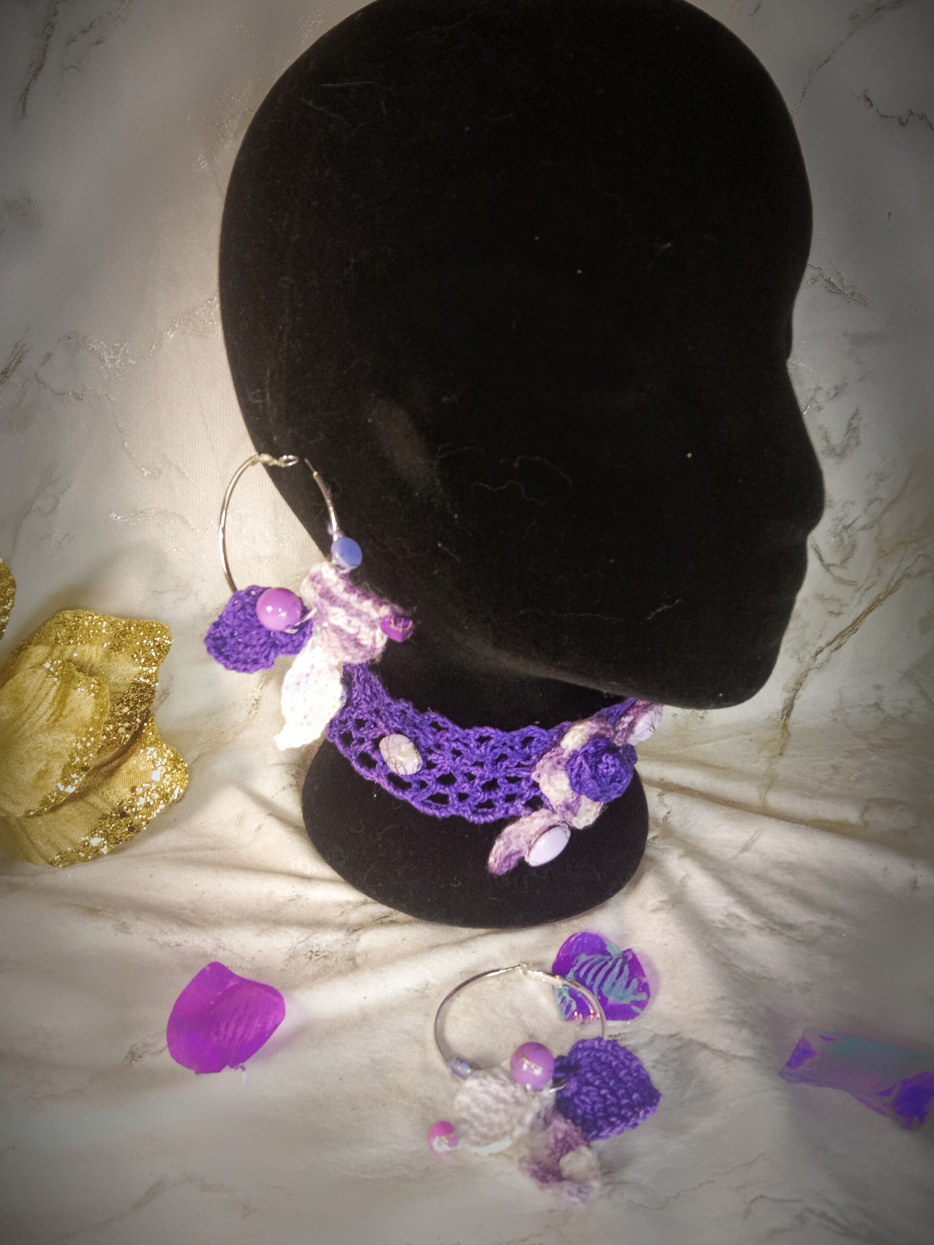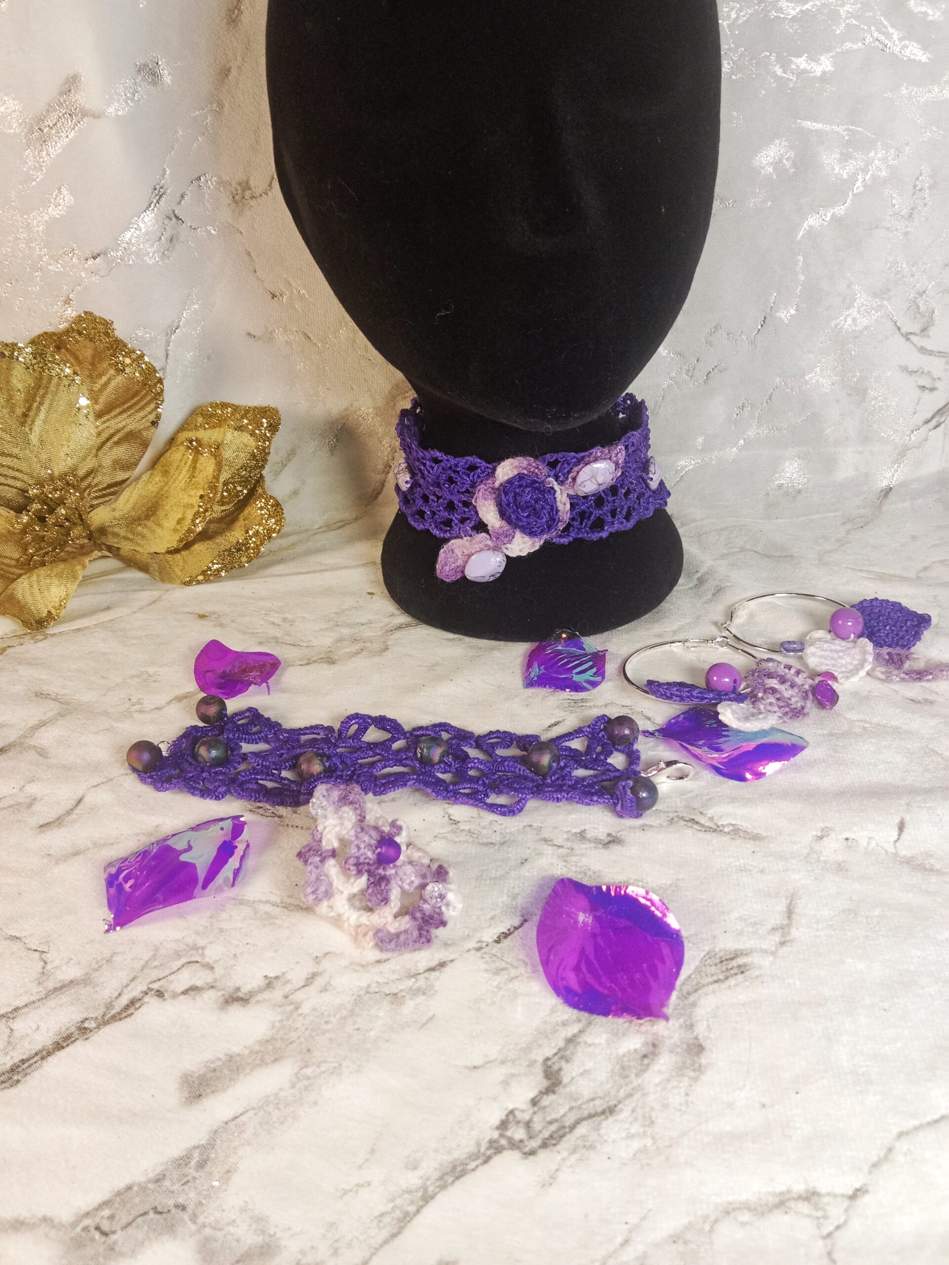 Manchette violette très fine et légère travaillée délicatement à l’aiguille. Technique Frivolité avec un fil mercerisé brillant. Une création travaillée avec passion qui offre un véritable bijou unique. De jolies perles Géode Agate Multicolore, en pierre naturelle semi-précieuses agrémentent cette manchette. Vous pourrez former un ensemble bijoux avec le collier ras du cou violet , les anneaux boucles d’oreilles fleurs et sa bague violette , le tout crocheté avec des matériaux soigneusement choisis. Un petit aperçu en vidéo: