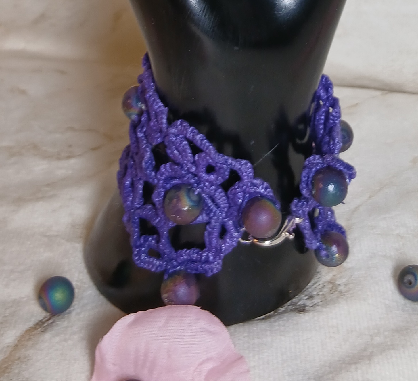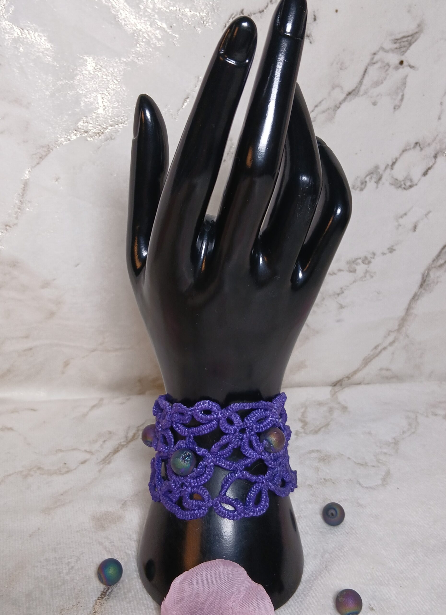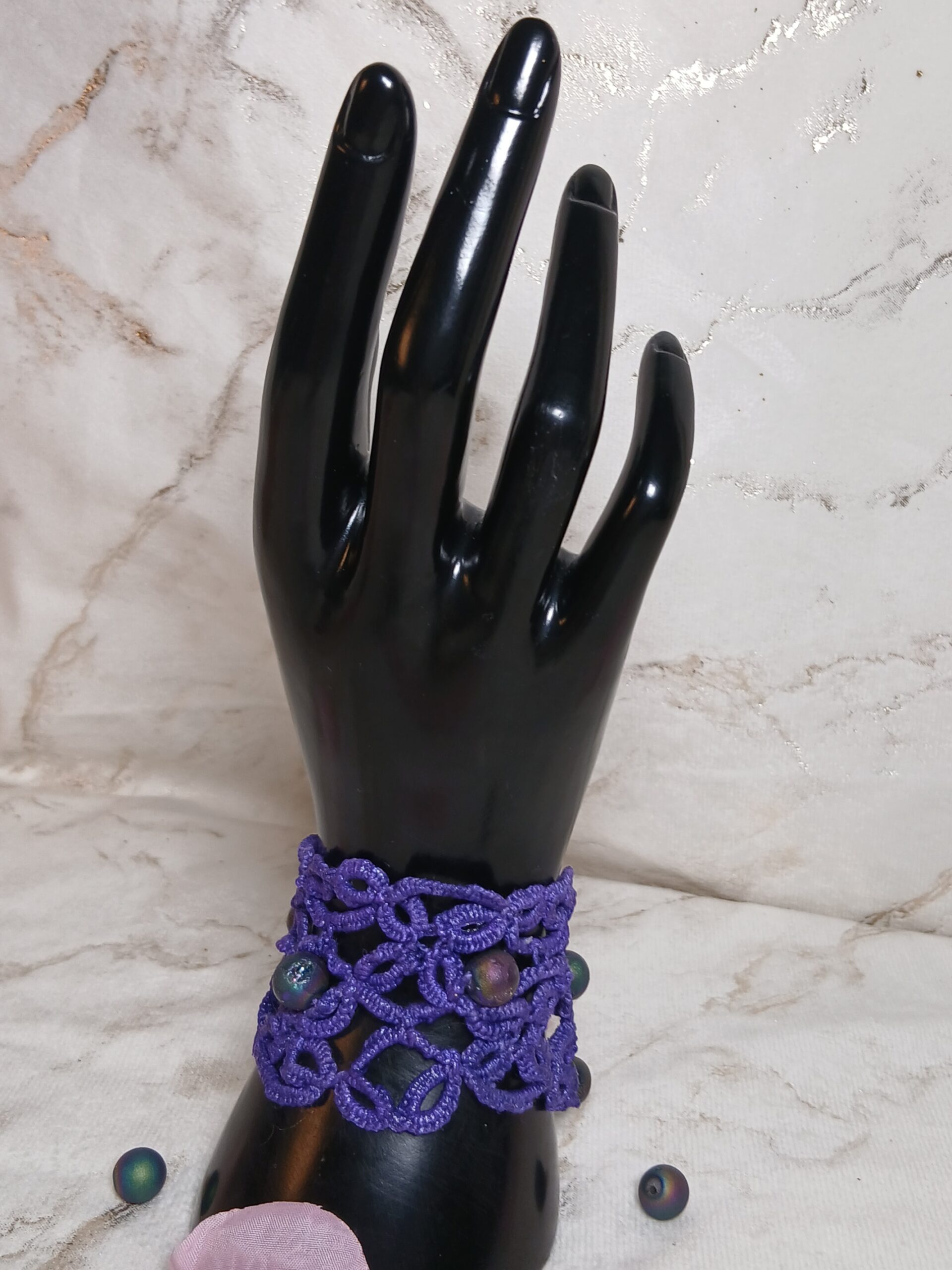 Manchette violette frivolité, travaille à l’aiguille. Une création unique, légère et élégante.