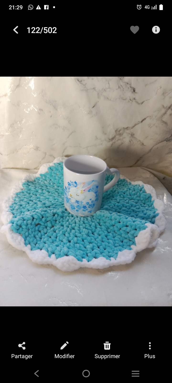 Napperon crocheté avec un fil chenille velvet très doux, effet velours. 100% polyester. Lavage à la main.