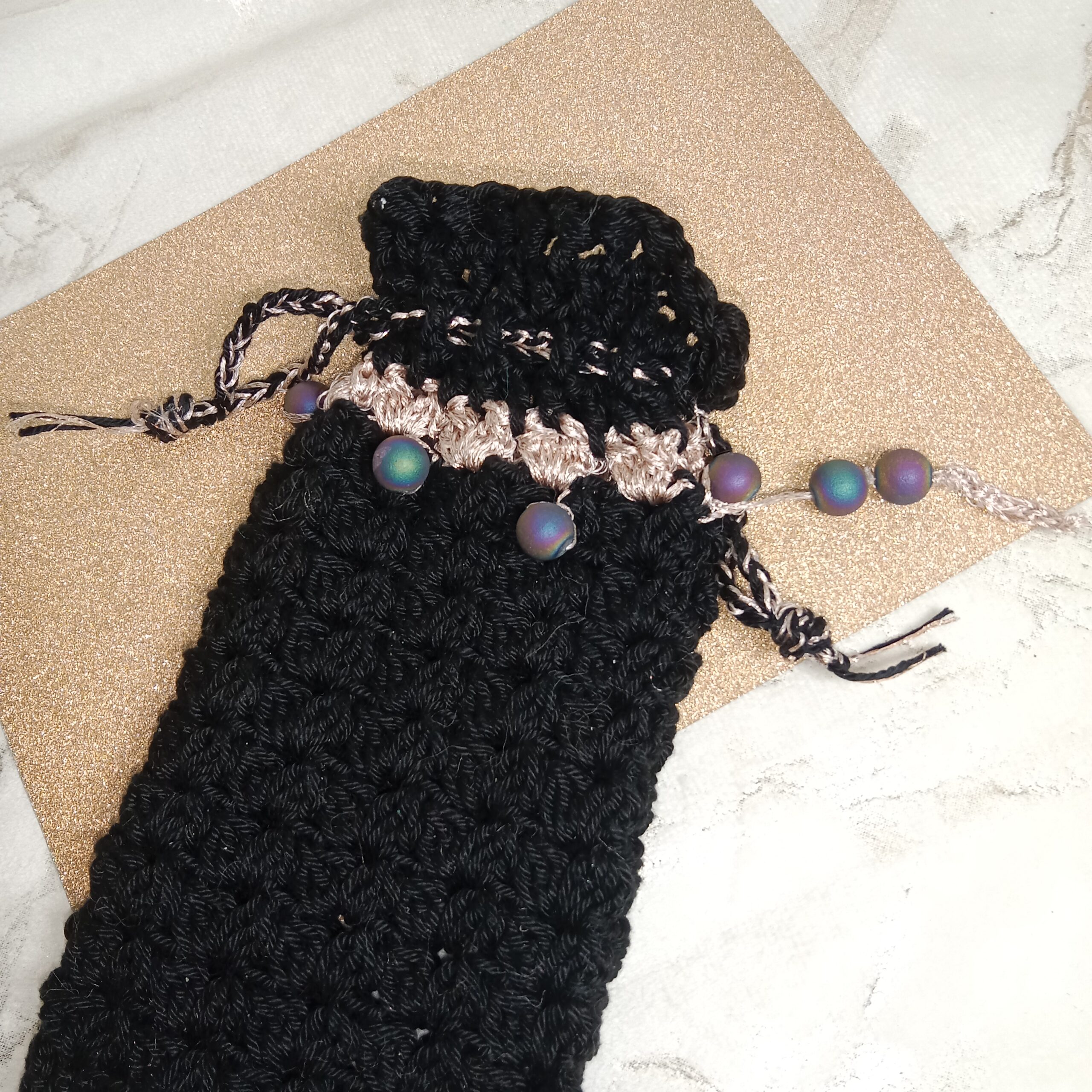 Petite pochette crochetée avec du fil noir coton  Oeko Tex  et fil très fin scintillant cuivré. De jolis perles Géode Agate Multicolore, perles naturelles semi précieuses viennent agrémenter la pochette. Elle pourra vous être utile pour mettre des bijoux ou encore vos lunettes. Légère et pratique. Vous pourrez constituer votre ensemble des bijoux . Un assortiment original crée avec passion. Lavable à la main.