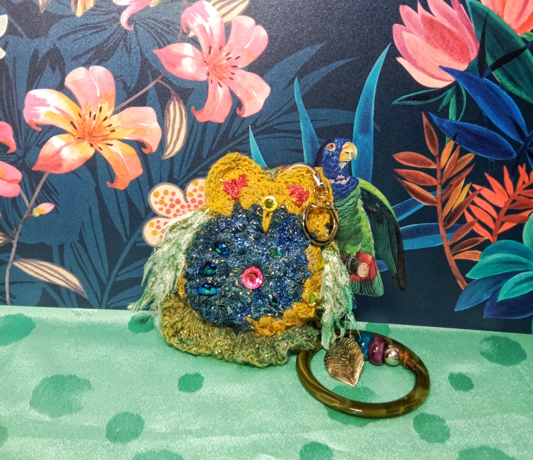 Petite chouette crochetée avec un fil coton scintillant aux dégradés de couleur. De jolies plumes peintes , strass, perles, enrichissent cette petite chouette originale.