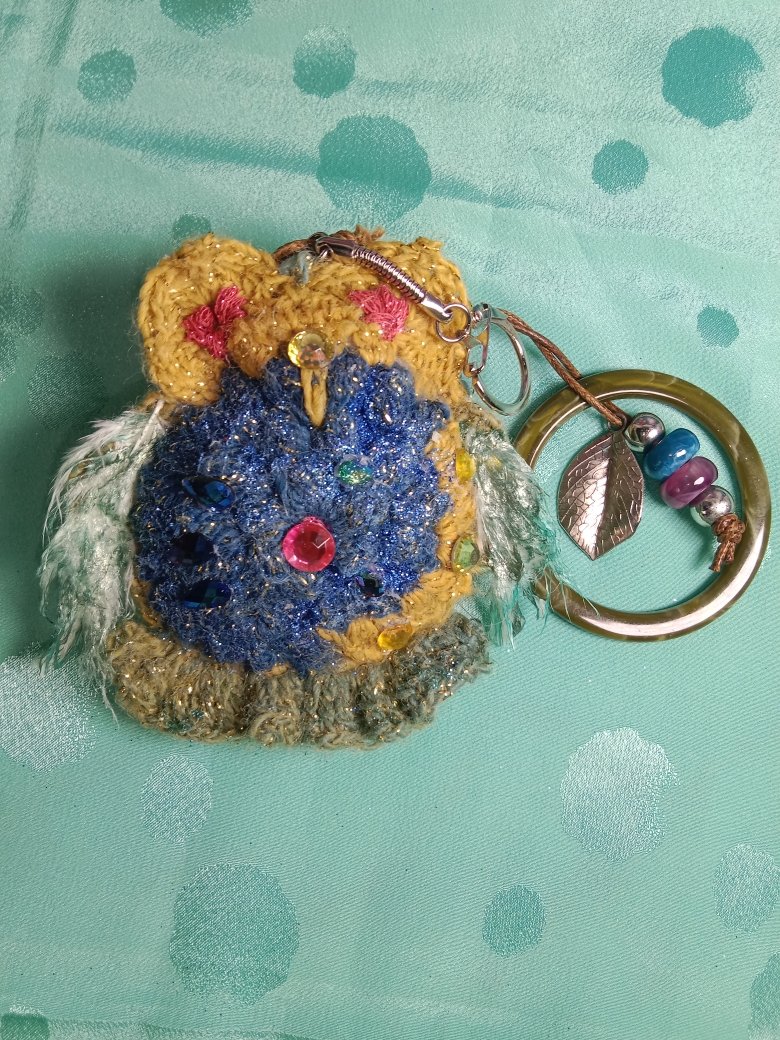 Porte-clé chouette au fil scintillant coton. Garnie de jolies plumes peintes, perles et strass.