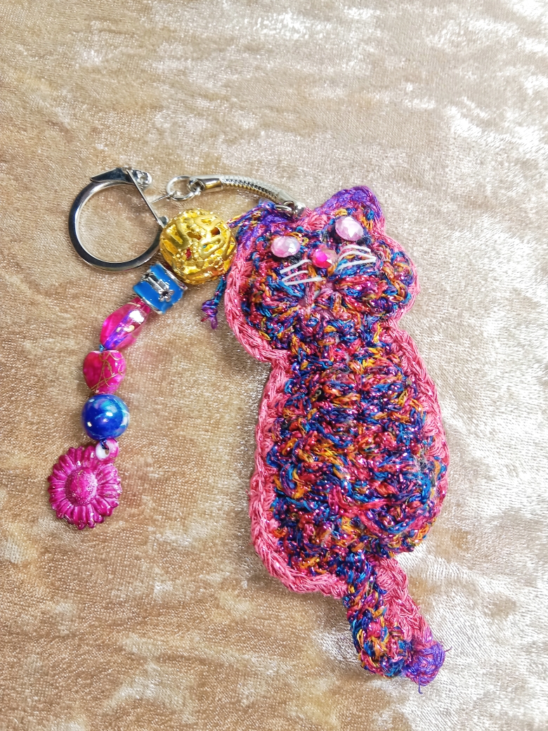 Porte-clés chat travaillé au crochet avec passion avec un joli fil lurex brillant multicolore. De jolies perles acryliques aux teintes choisies en accord avec le fil utilisé.  Un ensemble harmonieux et unique.