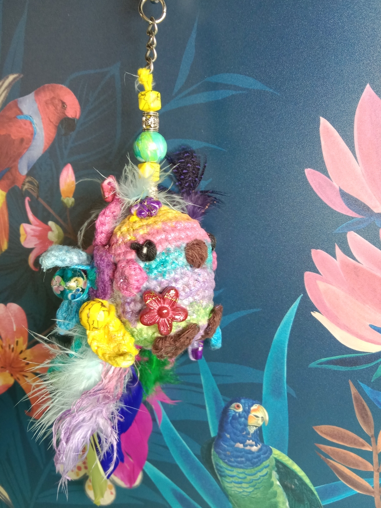 Très jolie oiseau crocheté avec fil coton dégradé de couleurs. De jolies plumes richement colorées enrichissent le porte-clés. Des perles acryliques multicolores ajoutent une touche exotique au petit oiseau. Vous pourrez également vous en servir en accroche décorative. Ne pas laissez à la portée des enfants.