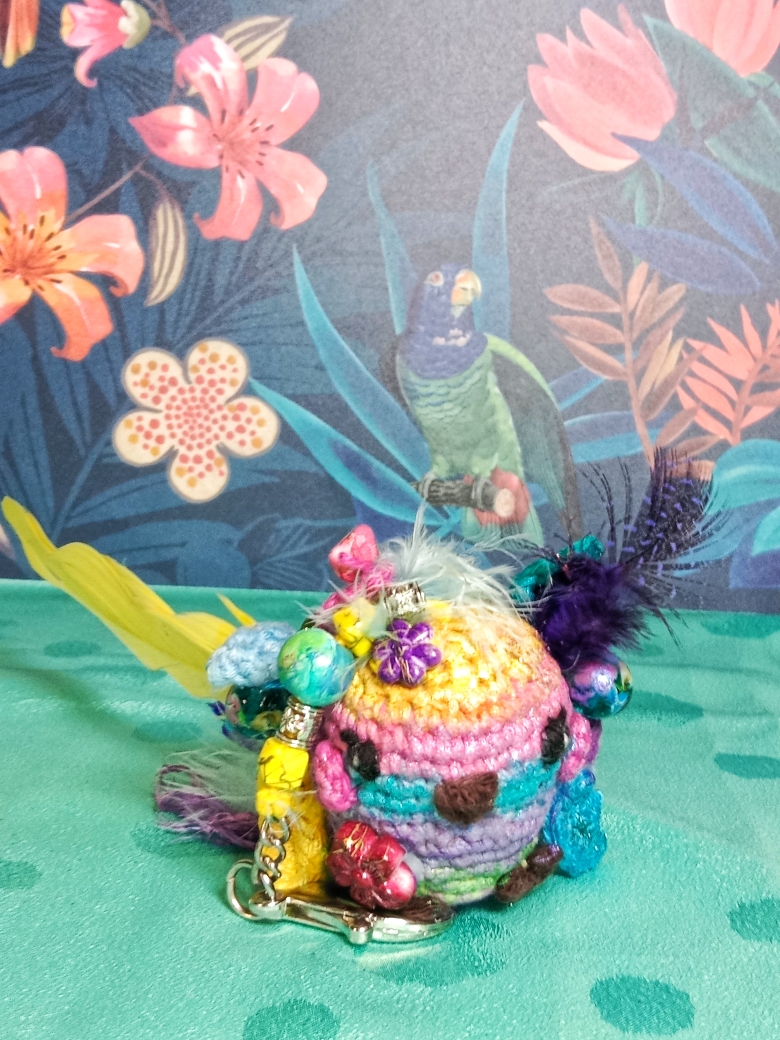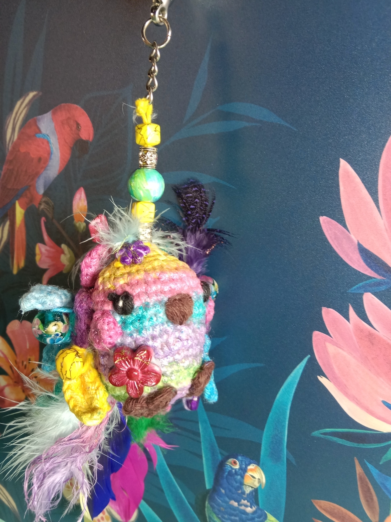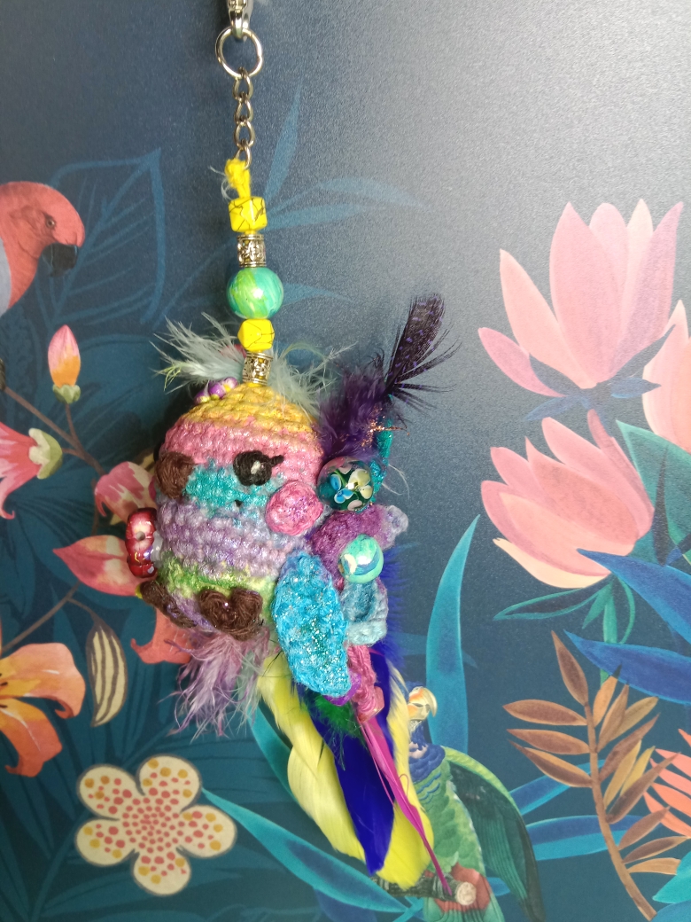 Petit oiseau tropical crocheté avec amour et passion. Les couleurs, fils, perles, plumes choisis on été minutieusement sélectionnés . Une création unique et originale. Ne pas laissez à la portée des enfants.
