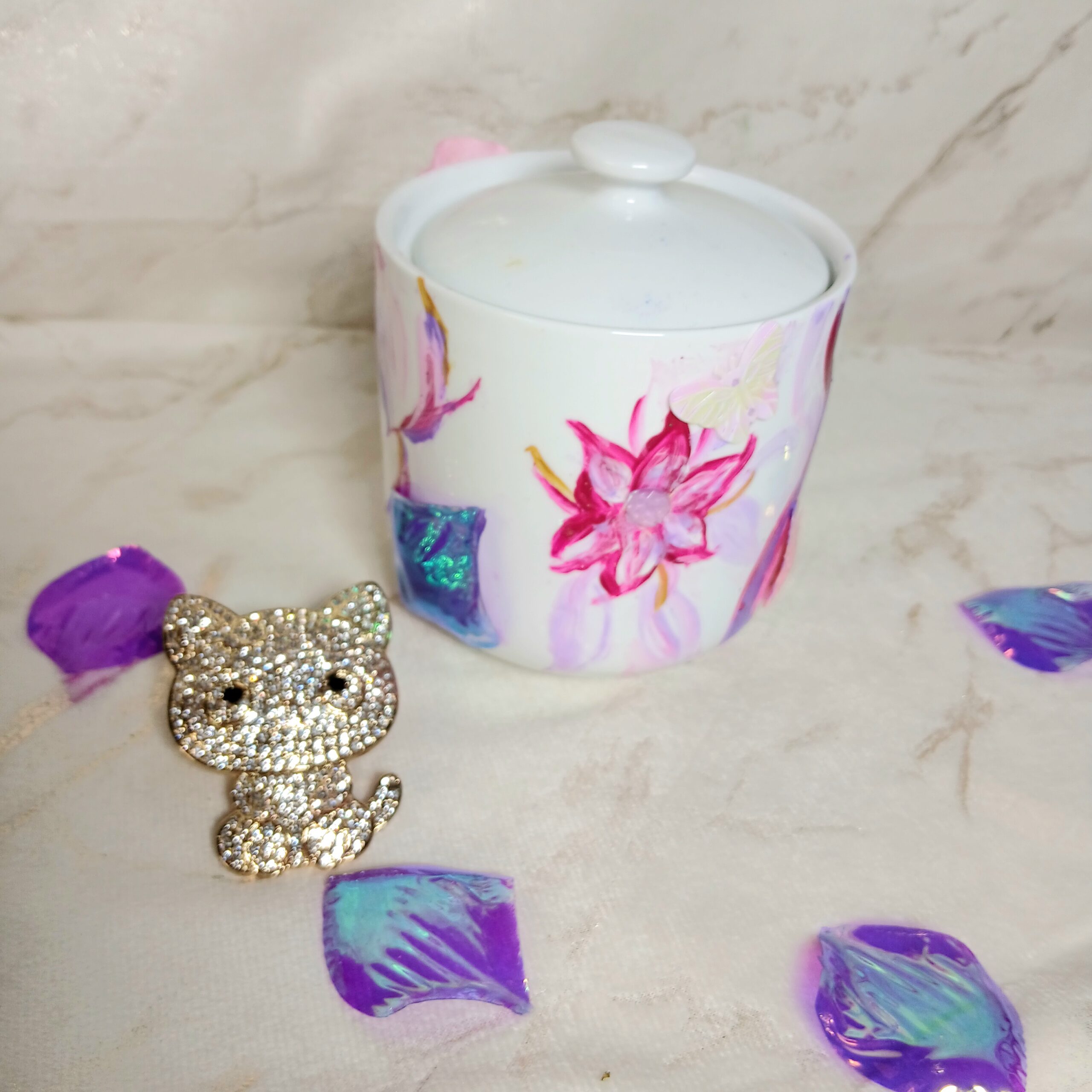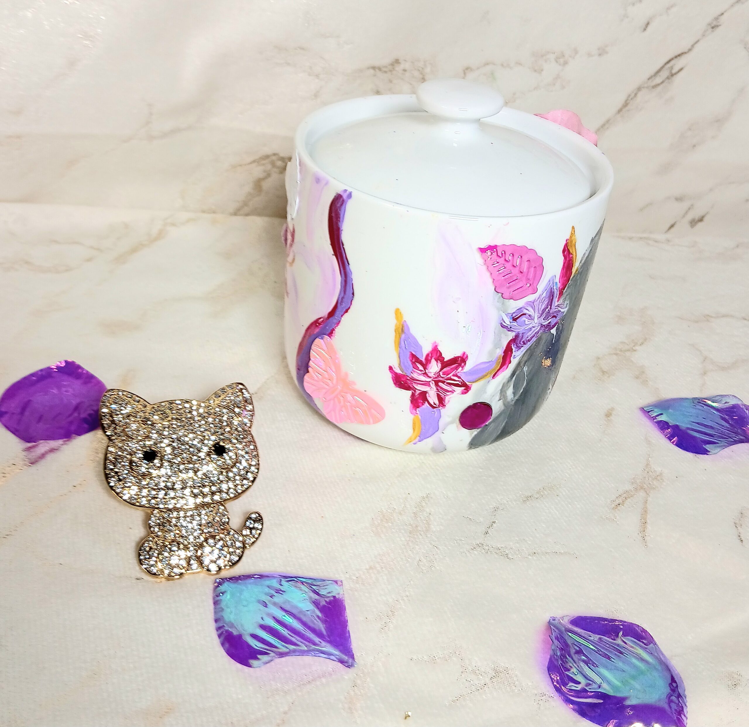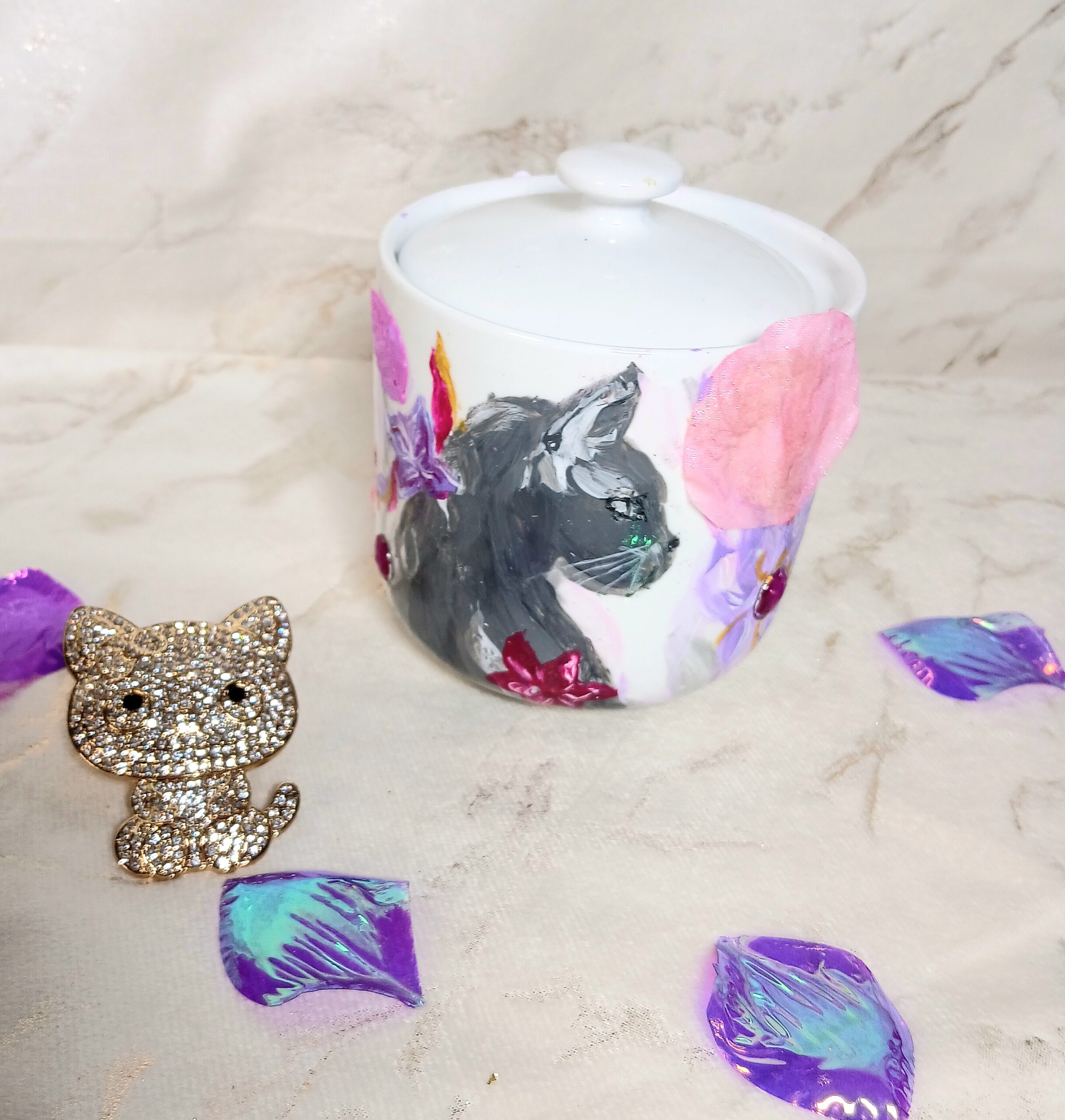 Joli pot en porcelaine décoratif, délicatement peint avec de la peinture pour porcelaine. Un chat peint en noir et blanc avec des fleurs en couleur.  Des feuilles et pierres précieuses sont collées dessus. Vous pourrez le passer à l’eau savonneuse mais ne pas frotter les peintures avec une éponge , ni le mettre au  lave-vaisselle. Ideal pour mettre des petites friandises.